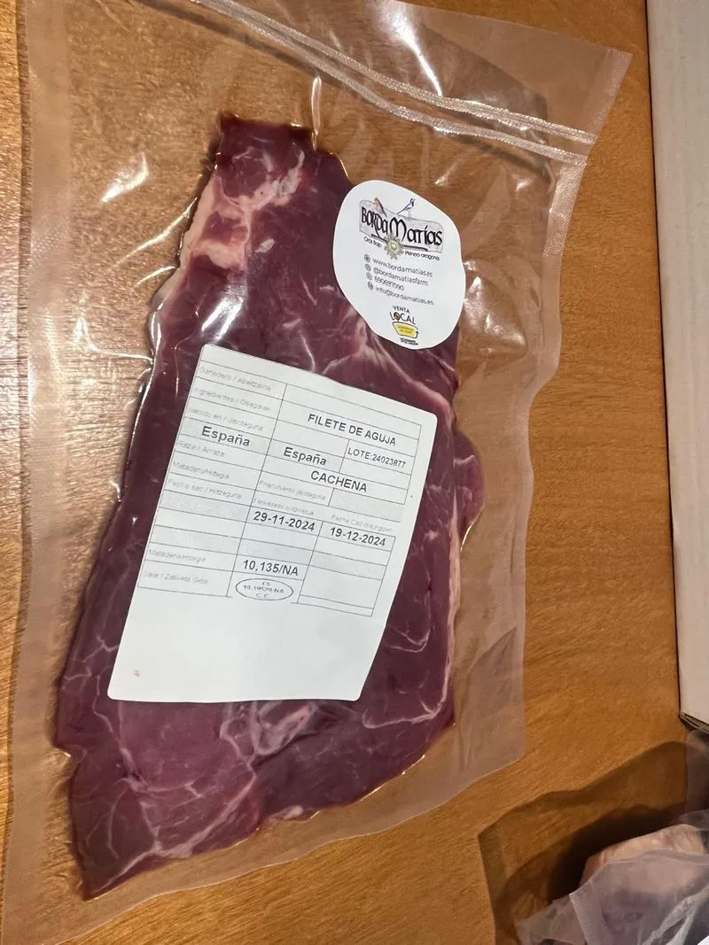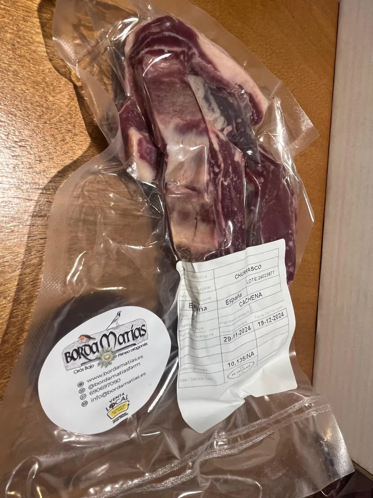 Cada lote se compone de carne para guisar (venas y pecho), filetes (espalda, aguja, tapa, cadera, babilla y contra), redondo, chuletas, churrasco, hamburguesas (solo carne y sal), y carne picada. Nuestros terneros Cachenos han sido criados en libertad en los campos de Orós Bajo, las choperas de Escuer, el puerto de Piedrafita de Jaca, y las pardinas de invierno. Nuestros terneros son procesados directamente al bajar de puerto, sin ningún tipo de finalización a pienso. La carne se ha madurado de forma controlada durante 18 días y está envasada al vacío, con una caducidad de unos 20 días. Se presenta en packs de unos 500 gramos, fileteada y preparada para cocinar. La carne picada y las hamburguesas son los productos con una fecha de caducidad más reducida.
