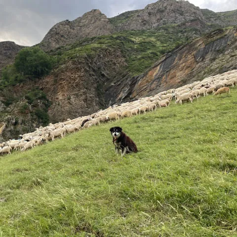 Para el manejo de nuestro ganado, utilizamos perros pastores de raza Can de Chira. Este perro es autóctono del Pirineo e iniciamos su recuperación en el año 2005 cuando estaba al borde de la extinción, recogiendo algunos de los últimos ejemplares de calidad. Su nombre significa en lengua aragonesa perro para volver (recoger) el ganado.