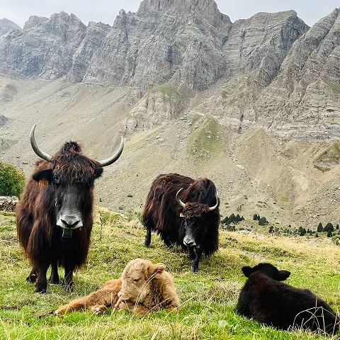 En 2021, nuestra granja se convirtió en pionera en la cría de Yaks en el sur de los Pirineos, estableciendo el primer núcleo de esta especie en el país. Motivados por su extraordinaria adaptabilidad y productos únicos, importamos jóvenes ejemplares para estudiar su adaptación y contribuir a su difusión.